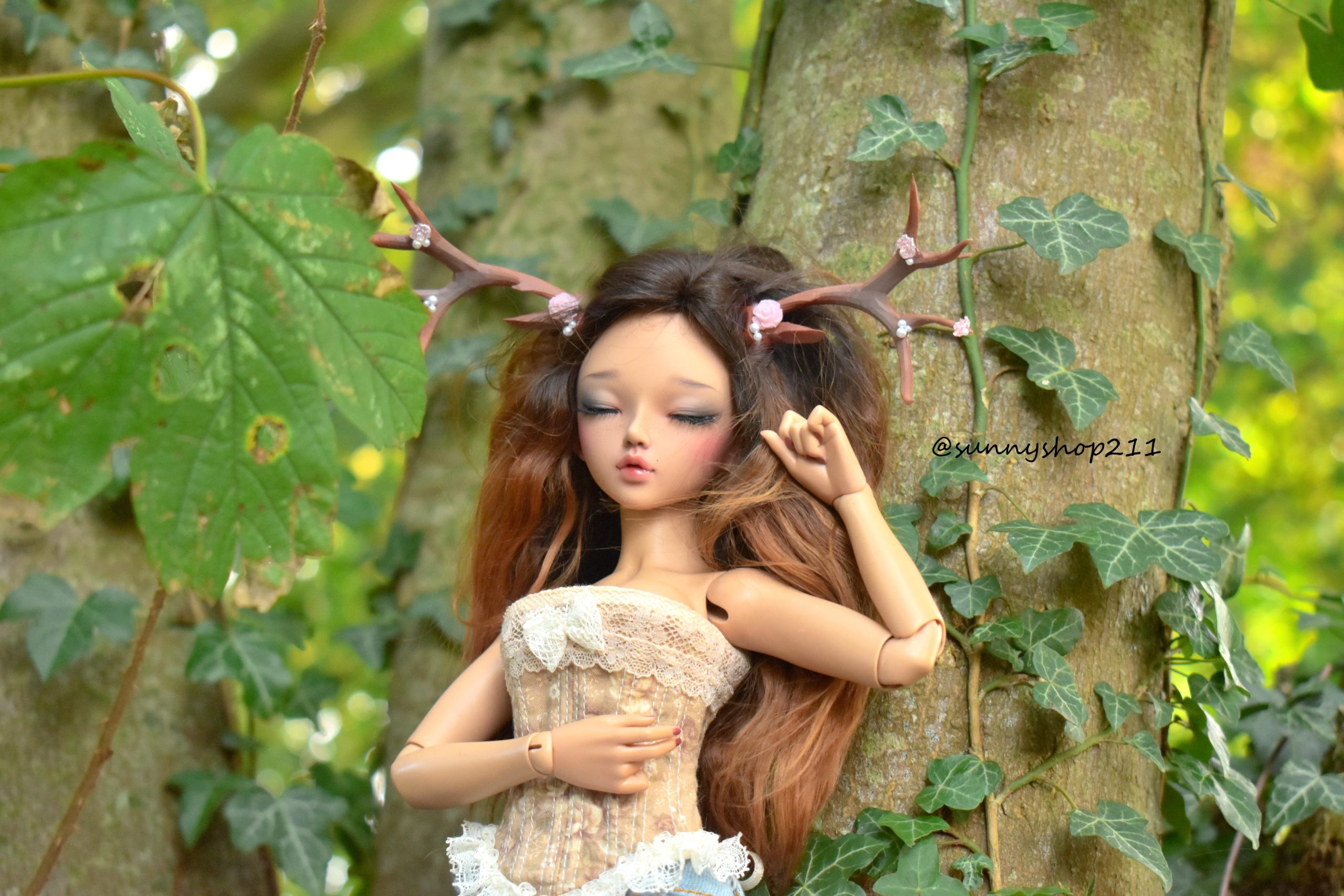 Sur sa tête, ses bois délicats sont décorés de petites roses pâles : elles poussent réellement sur elle, nourries par la magie de la forêt.