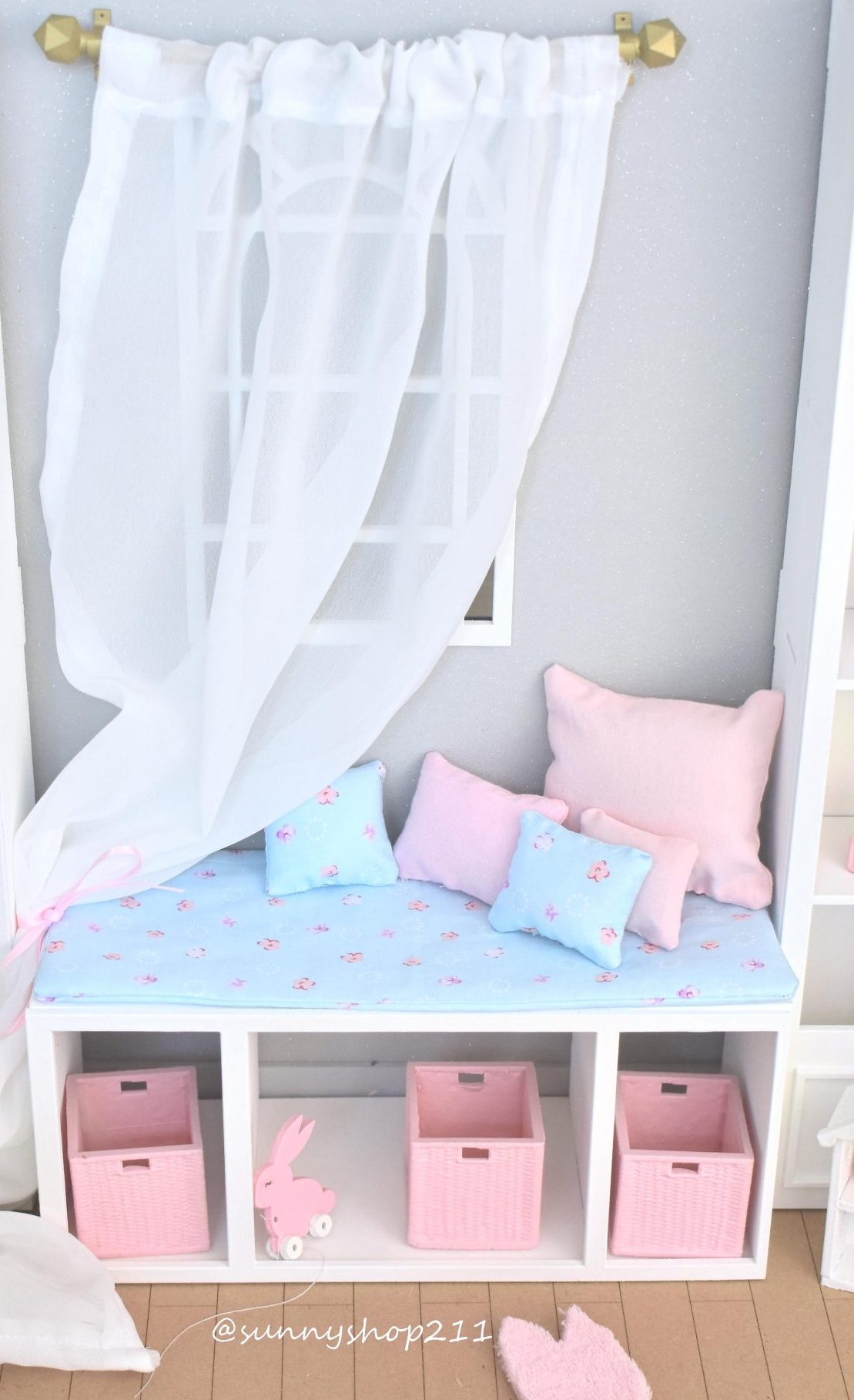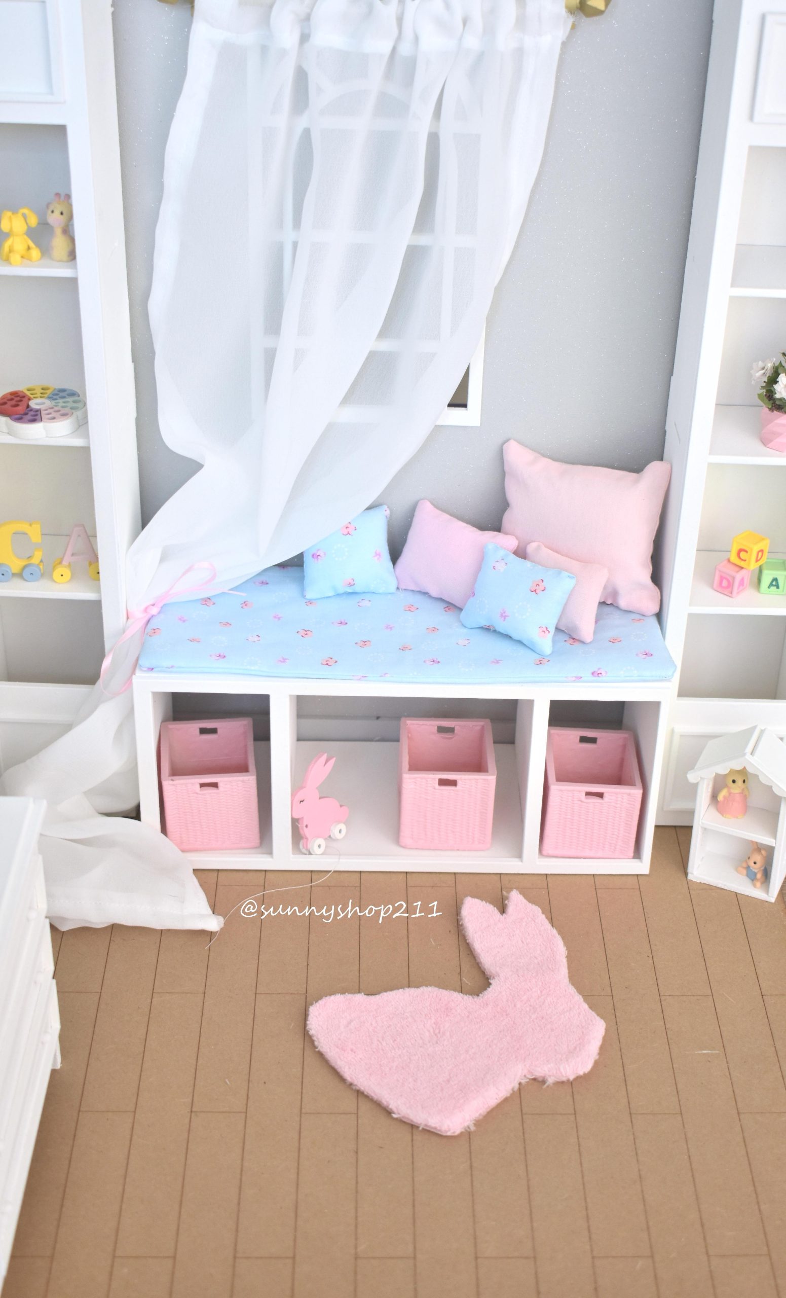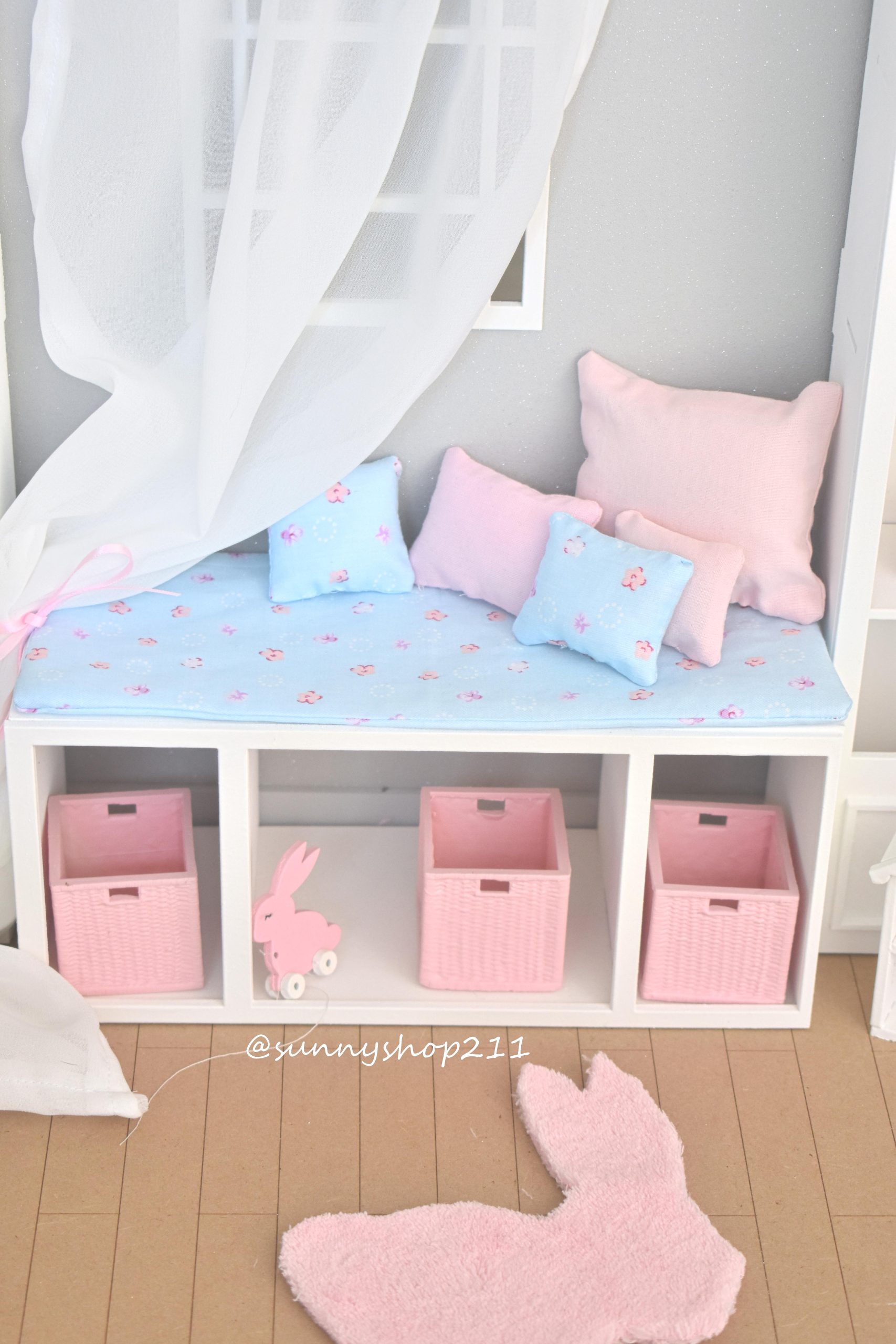 This bench seat with shelves, miniature 1/6 scale is perfect for creating a cosy corner, dressing room or elegant storage space in your dioramas.