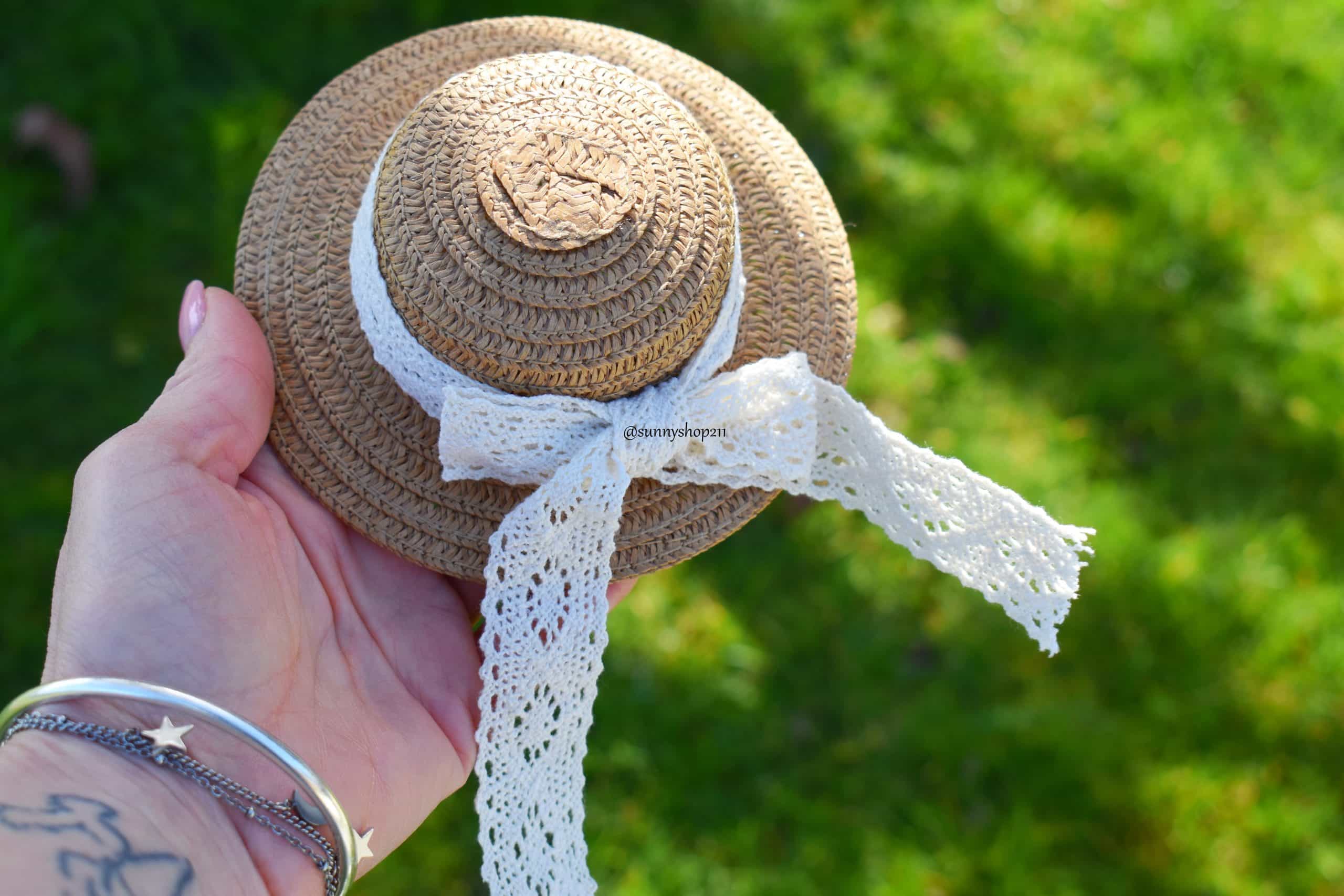 It measures approximately 12.5 cm in diameter, 7 cm wide around the inside and 4 cm high. It's made of straw and accessorized with a small beige lace ribbon.