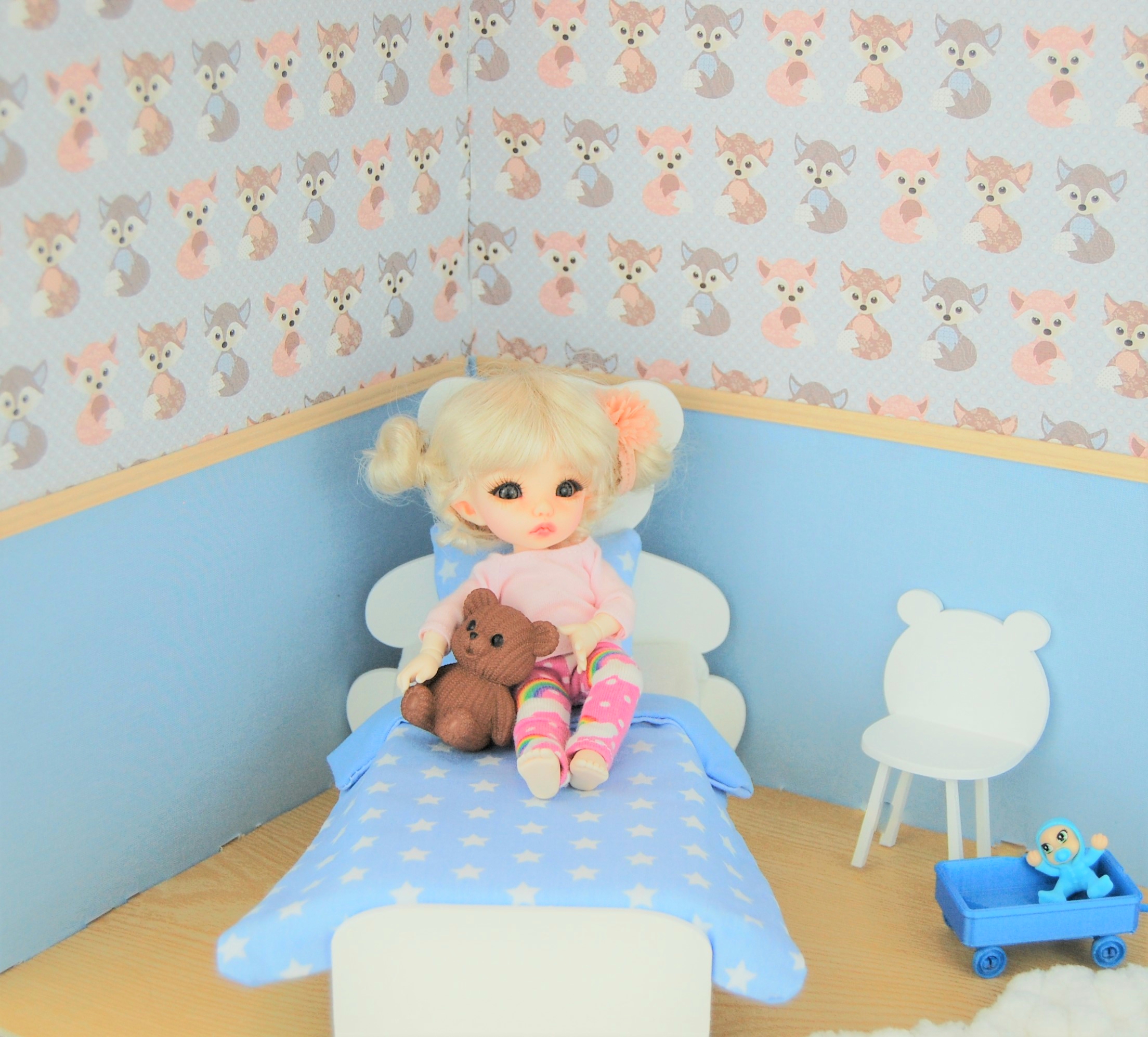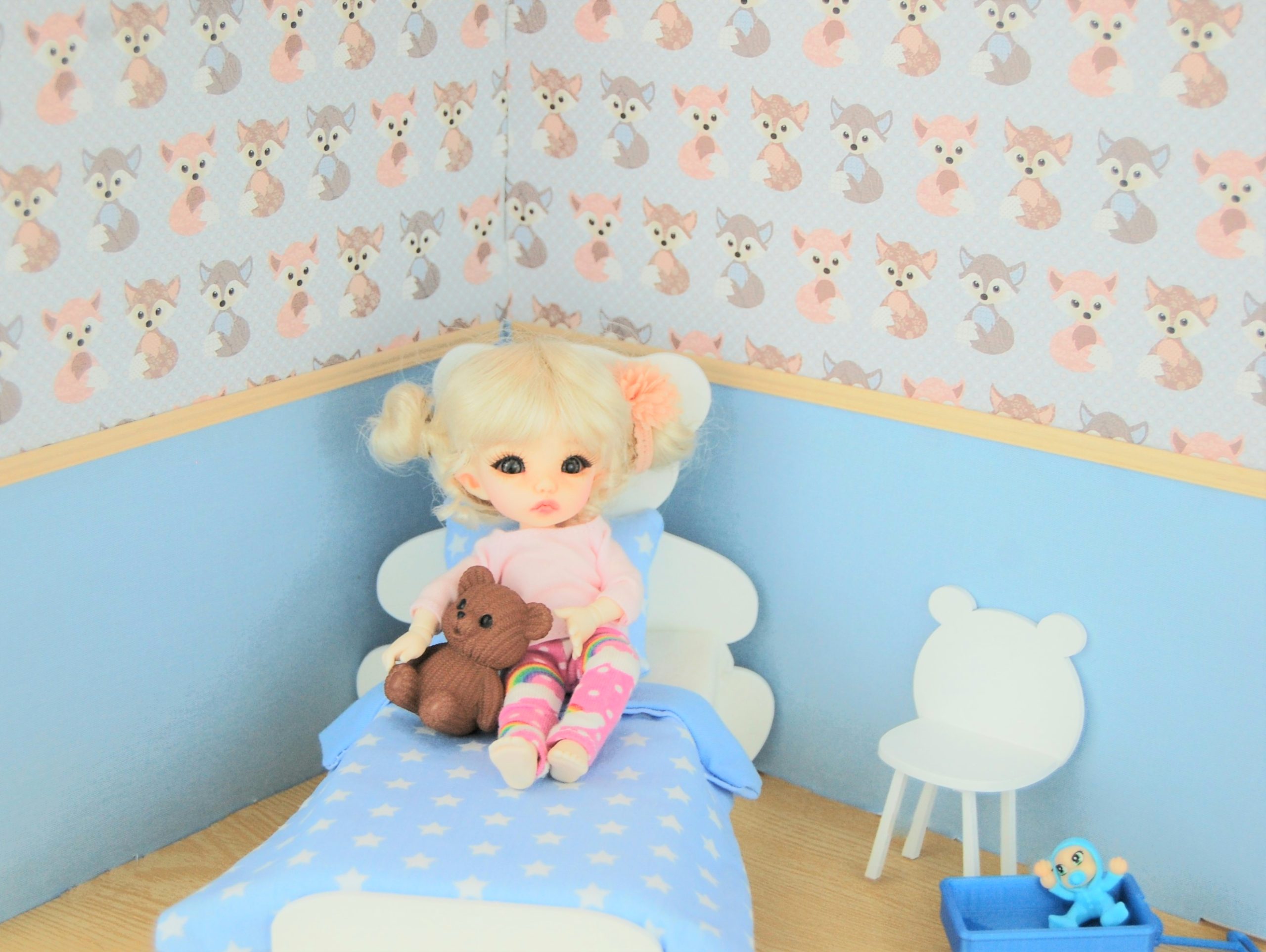 This miniature teddy bear bed 1/8 is a soft and comforting piece of furniture, ideal for creating a cosy atmosphere. nursery, A soft universe or a cocooning scene for your little dolls.