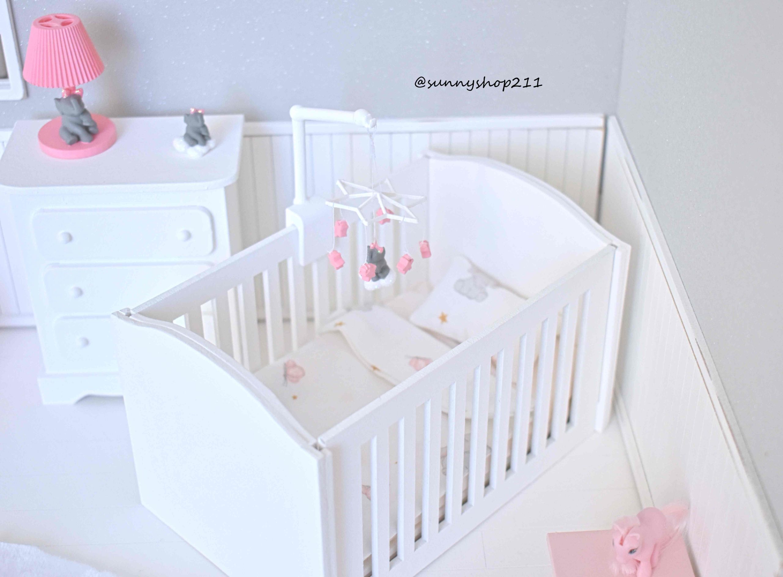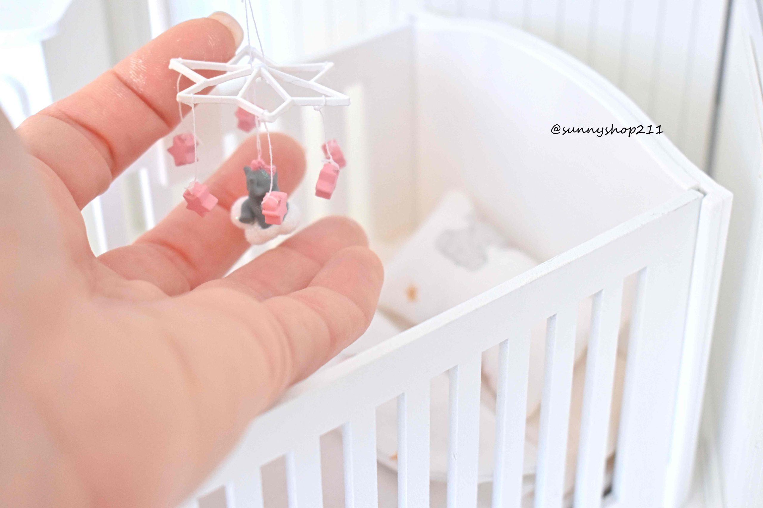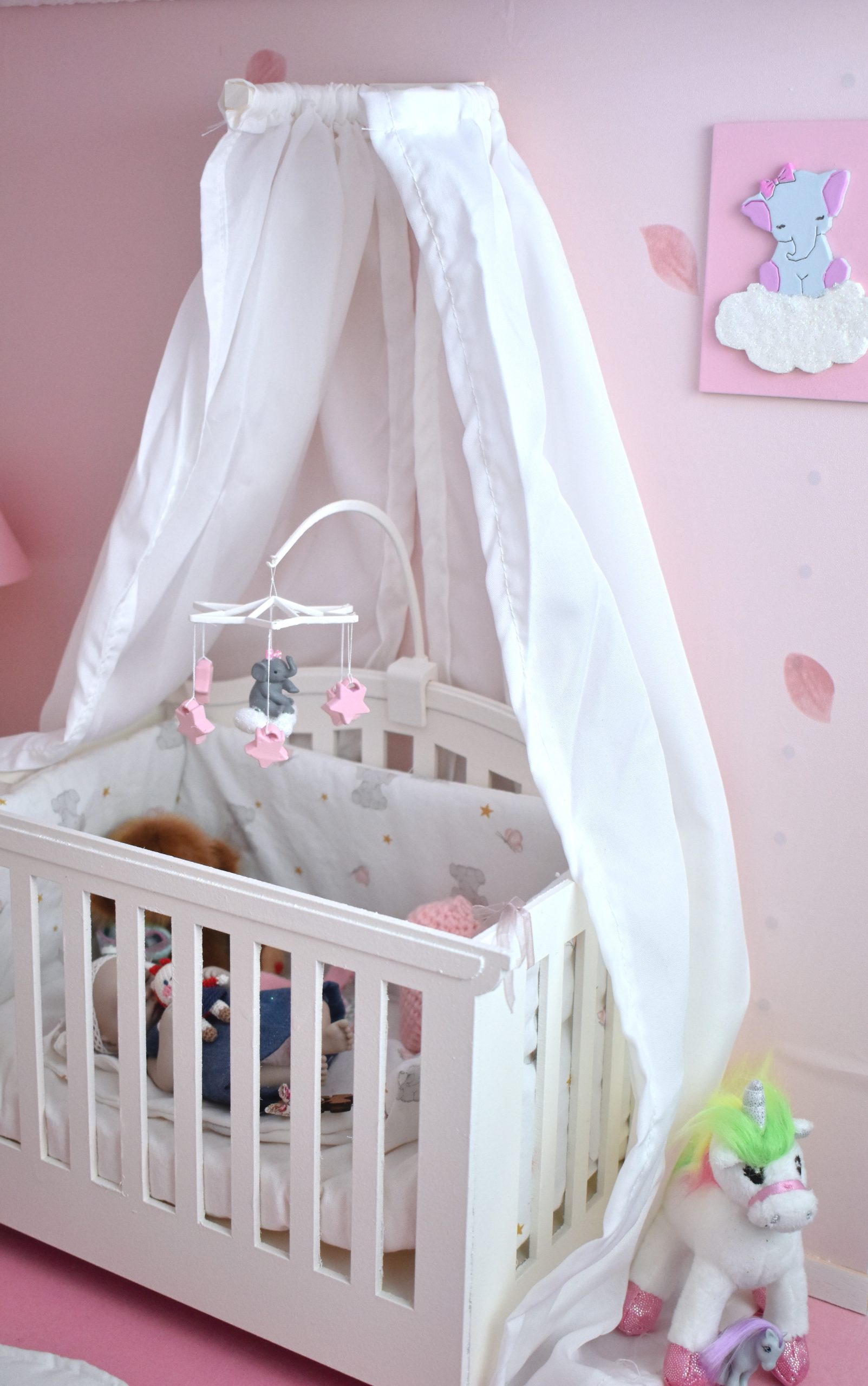 Ce mobile éléphant miniature est conçu pour accessoiriser les lits de vos bébés dolls et apporter une touche douce et poétique à vos mises en scÚne de nursery.