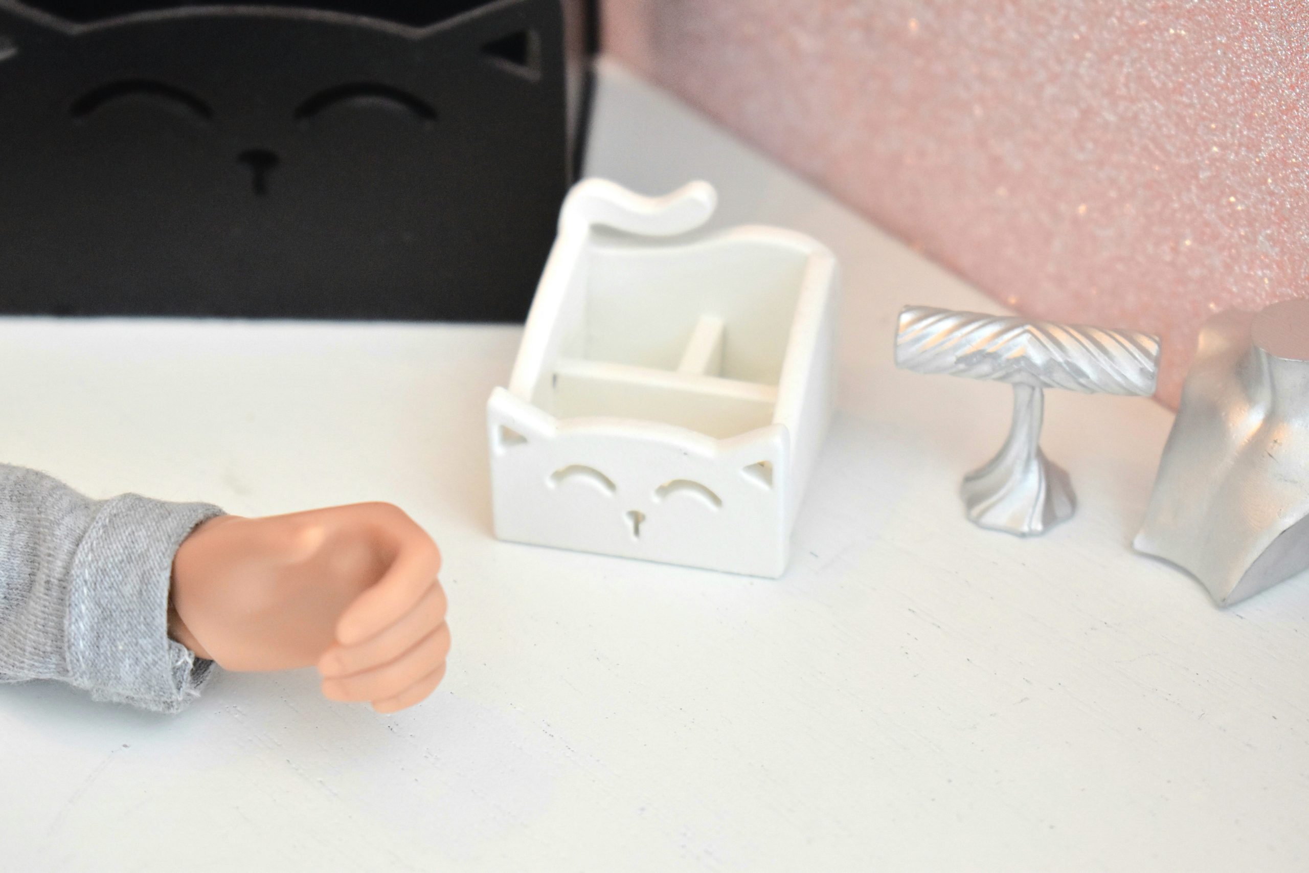 Cette boîte de rangement chat miniature est idéale pour organiser et mettre en scène les accessoires de beauté, de coiffure ou les petits objets du quotidien de vos dolls 1/3.