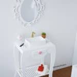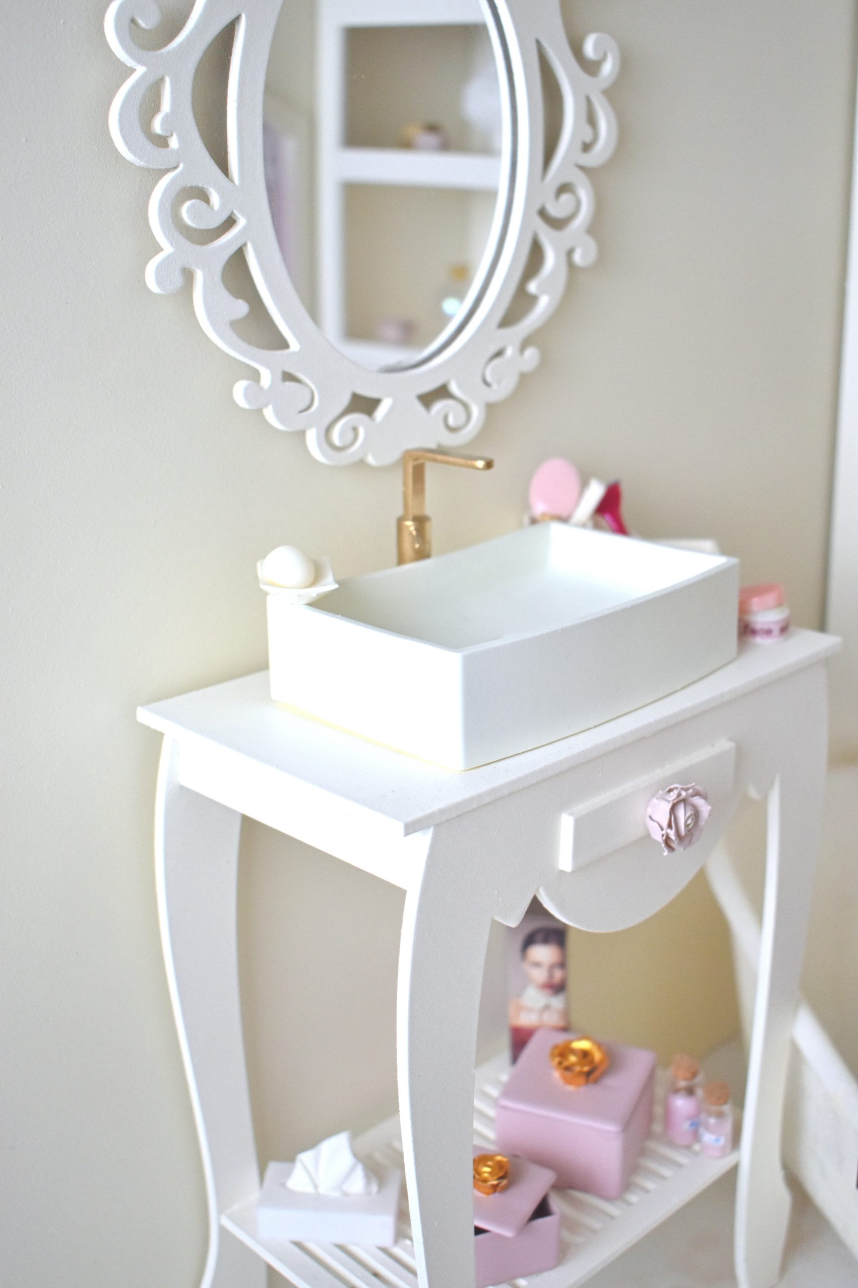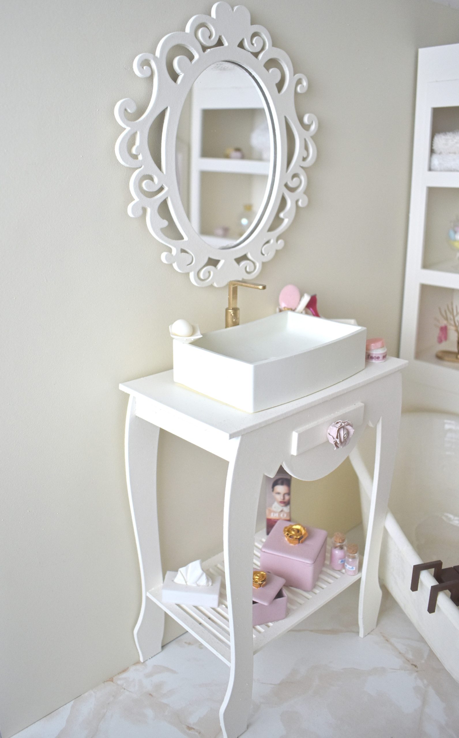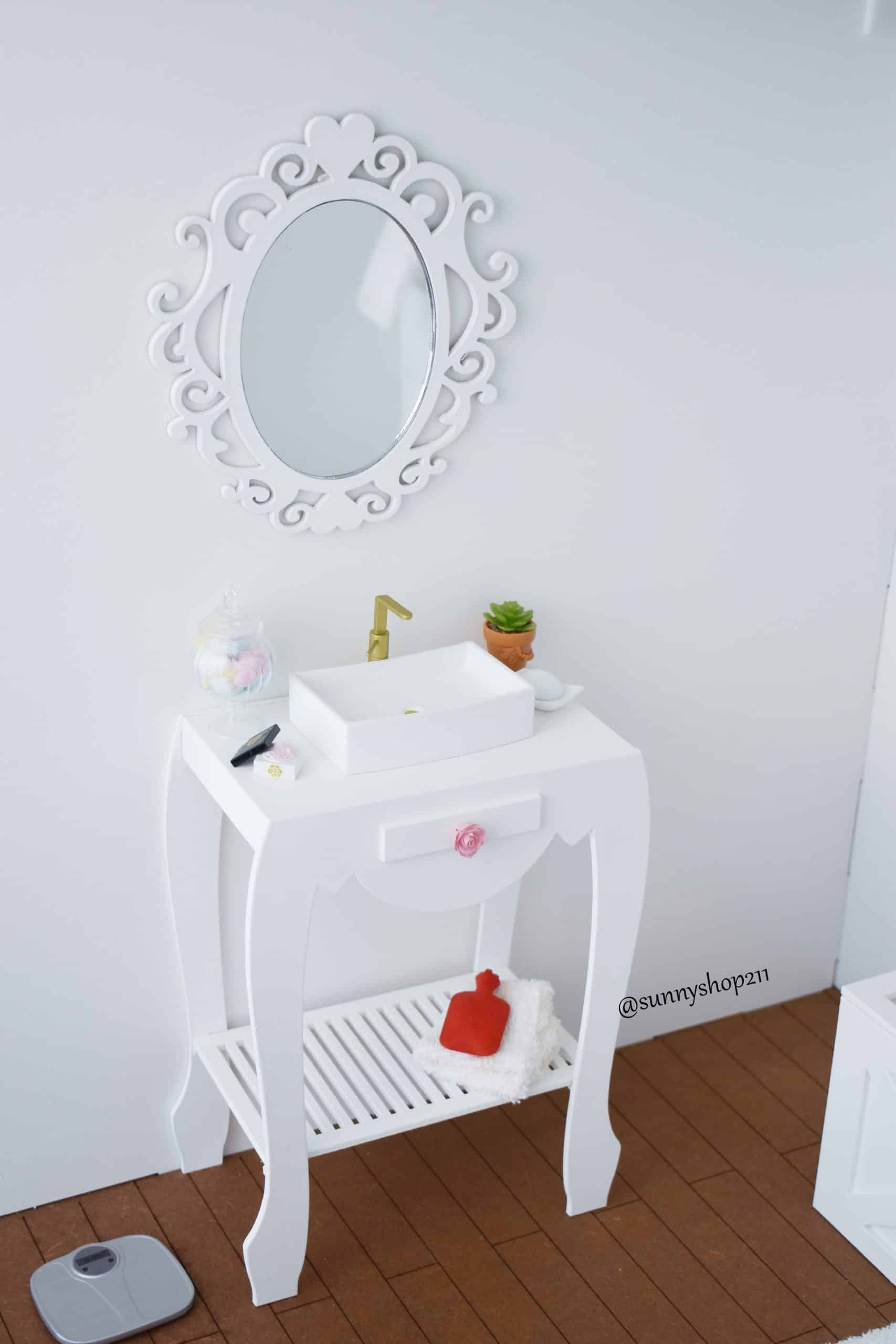 Ce meuble de salle de bain miniature 1/4 est idéal pour compléter et personnaliser vos salles de bain miniatures.